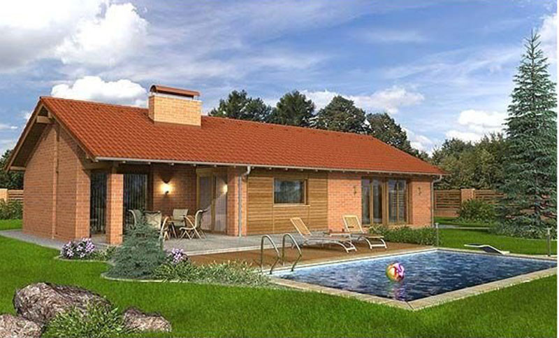 Uno 2 je dům je vhodný do nižší okolní zástavby = vhodný pro rovinatý, popř. mírně svahovitý pozemek = noční klidová část domu je osazena samostatně od denní části. Výhodou je využití kryté terasy.